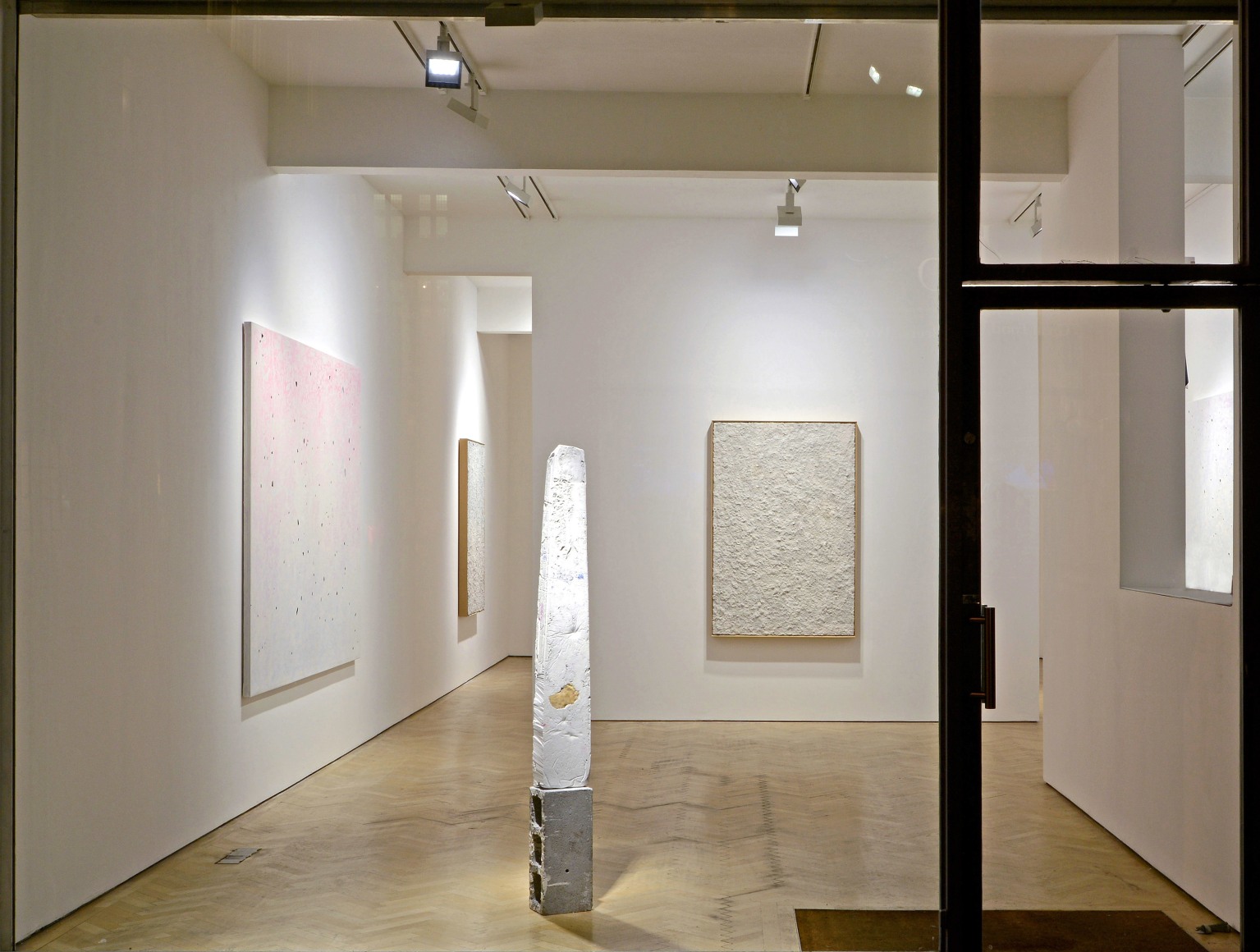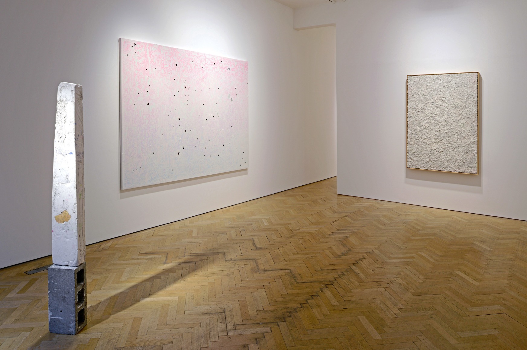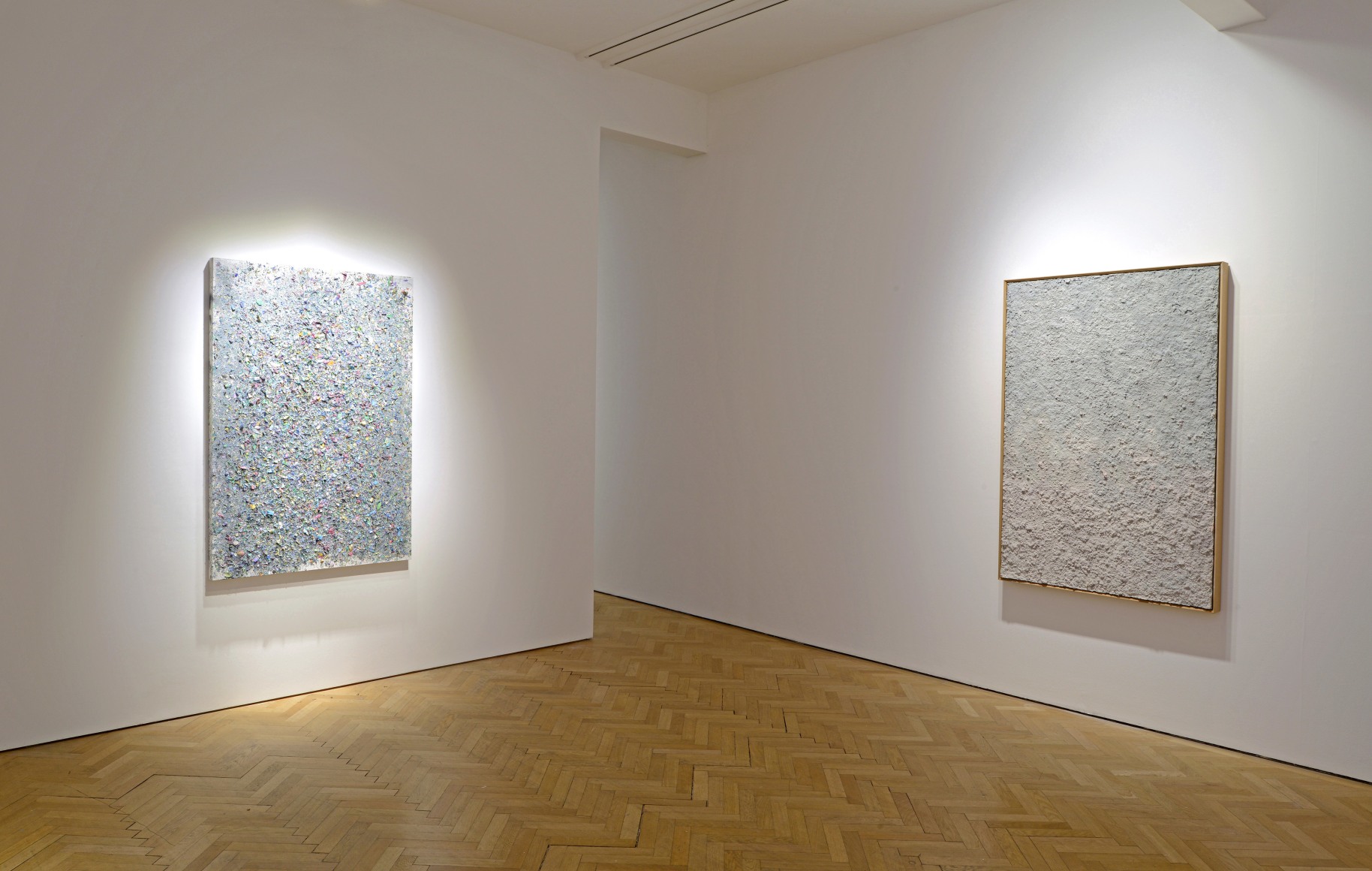 hydrocal, fiberglass mesh, iron rebar, canvas, spray paint, pulverized paintings, urethane, and concrete.
